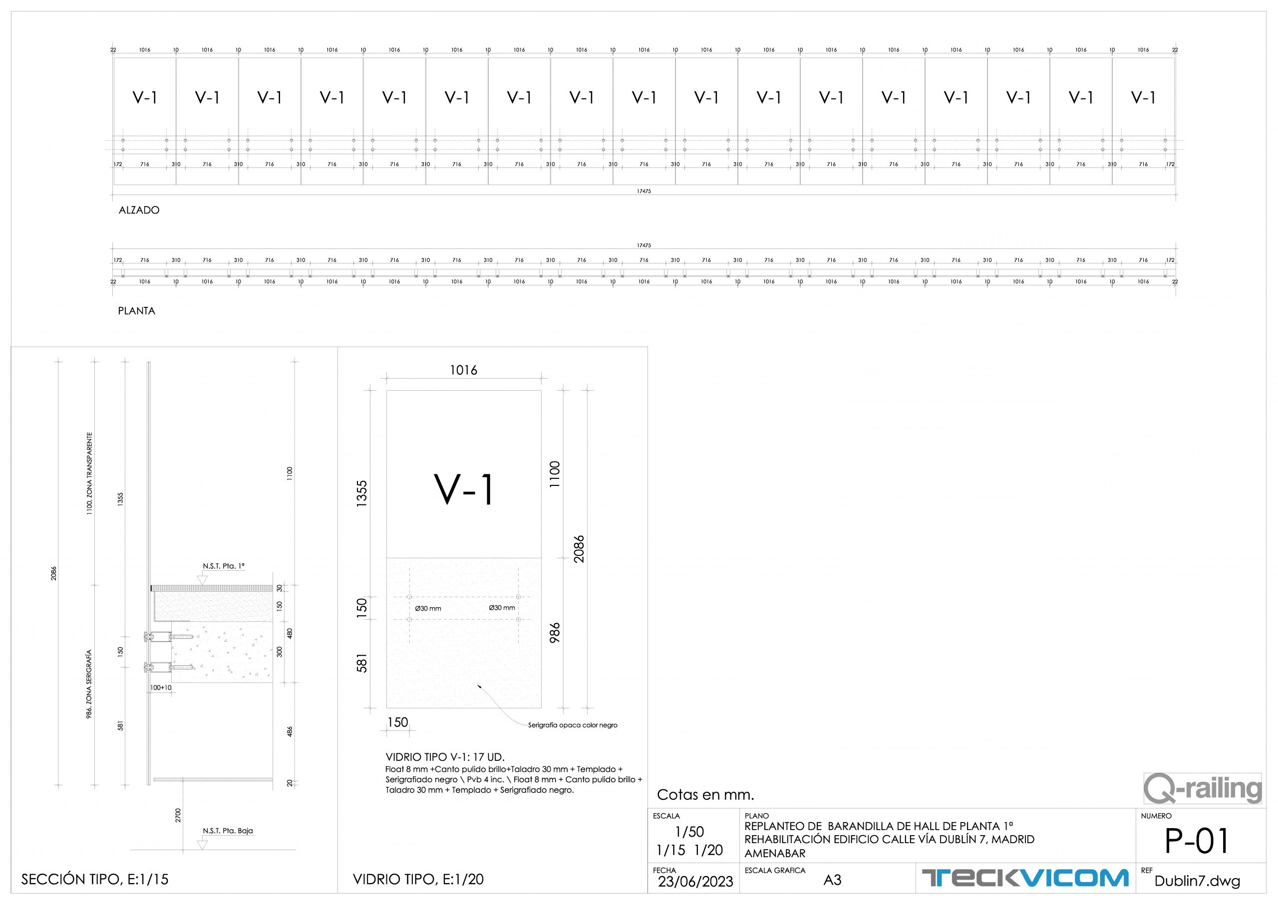 Barandilla conector Q-railing 0749 y vidrio laminar templado 8+8.4 serigrafiado
